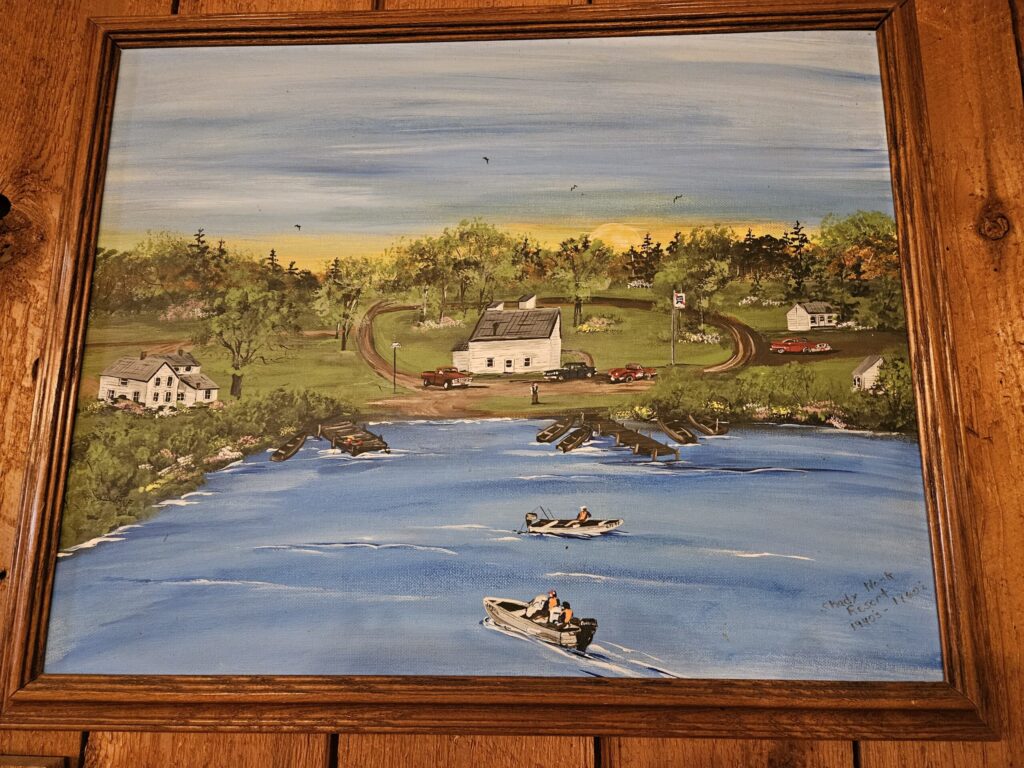 This Shady Nook resort was what the property evolved to between the 1940s – 1960s. You can also find this painting on the restaurant wall. At this time Shady Nook was primarily a bar and a resort with six white cabins along the water for families to come and visit. Boaters would travel miles around to enjoy a drink at the Nook.
